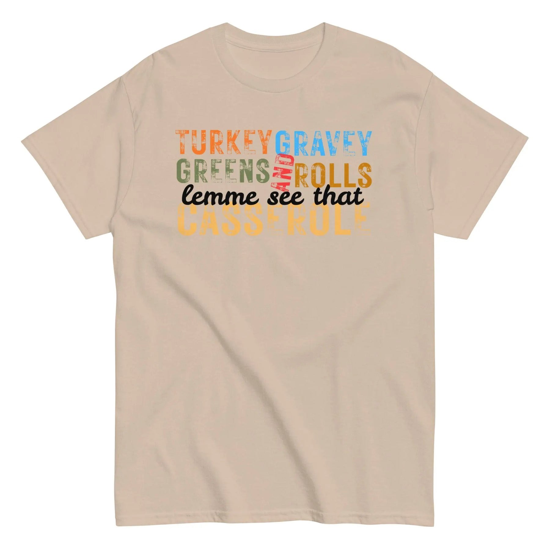 Bring the party to the table with our Funny Holiday Dinner “Turkey, Gravy, Greens, and Rolls, Lemme See That Casserole” T-Shirt!