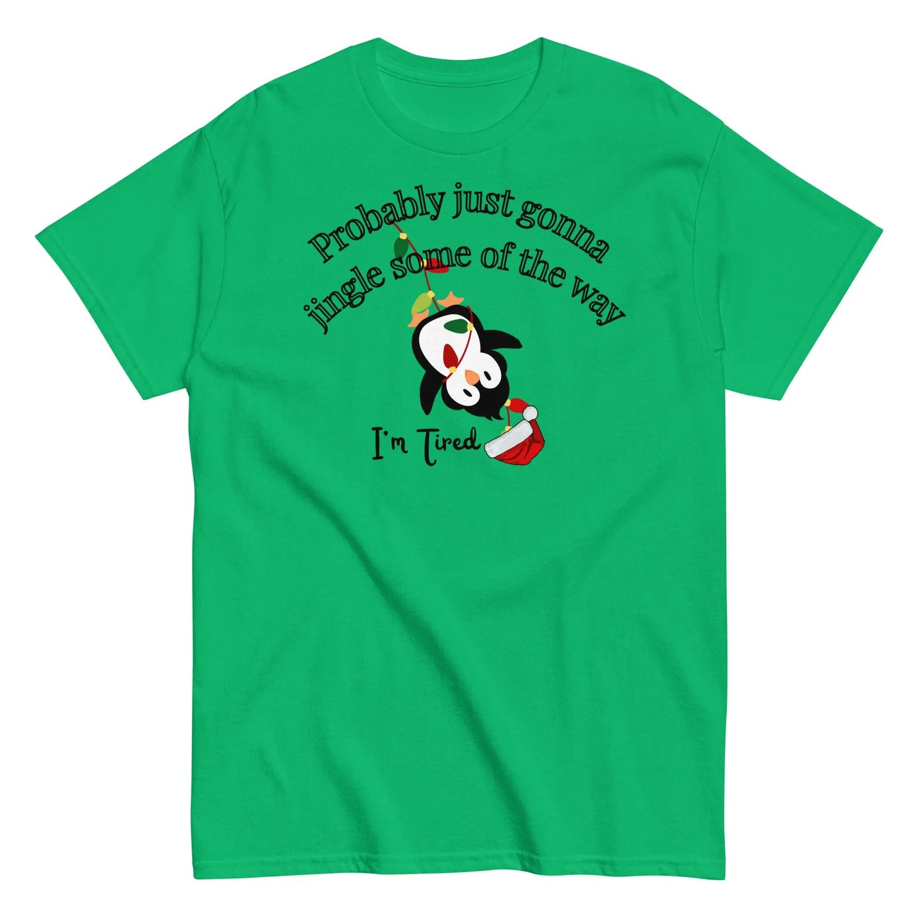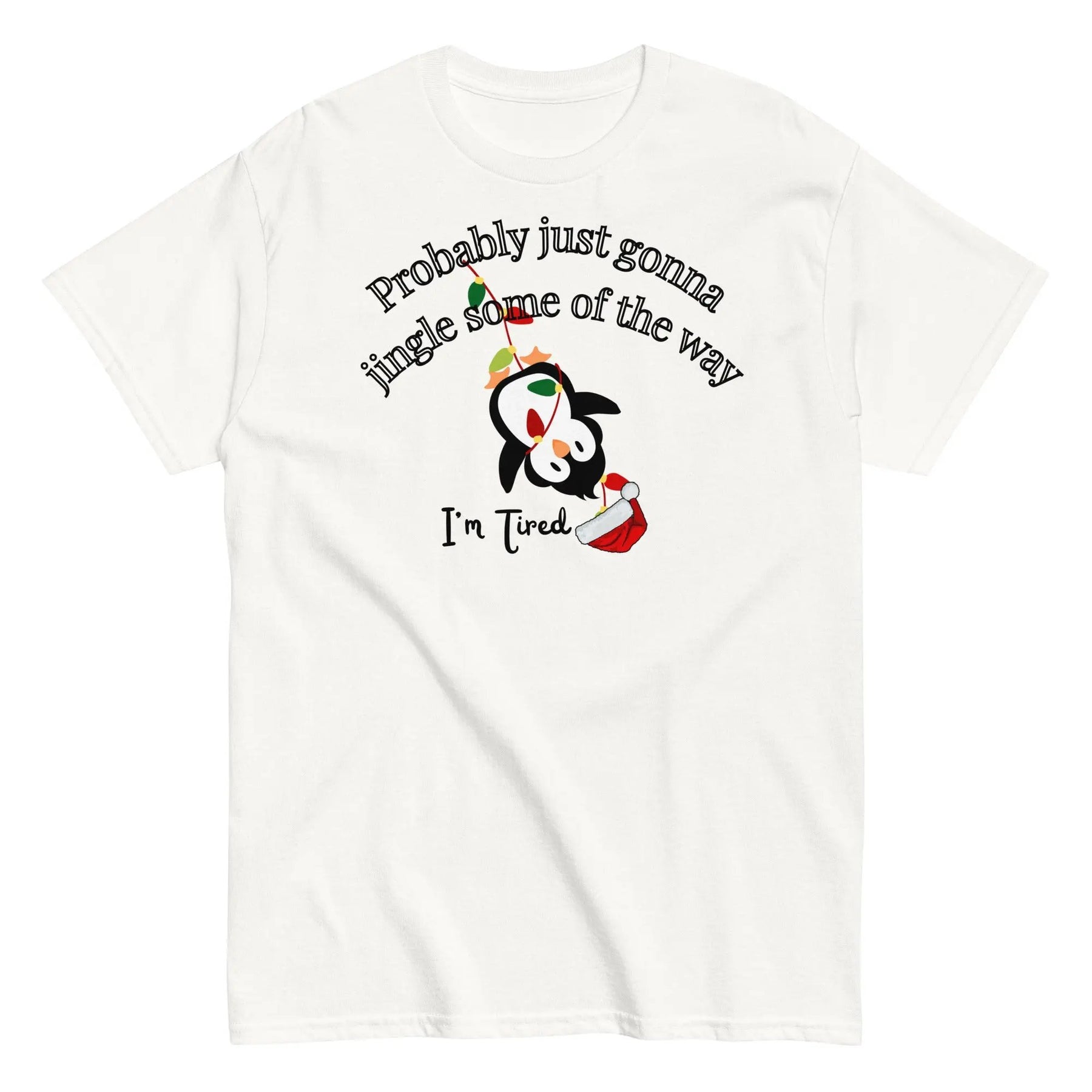 This cozy holiday t-shirt features an adorable penguin tangled in Christmas lights with the hilarious phrase “Probably just gonna jingle some of the way, I’m tired.” Perfect for anyone who loves festive humor, comfy tees, and a dash of relatable holiday spirit. Great for Christmas parties, gifts, or lounging in style all season long!